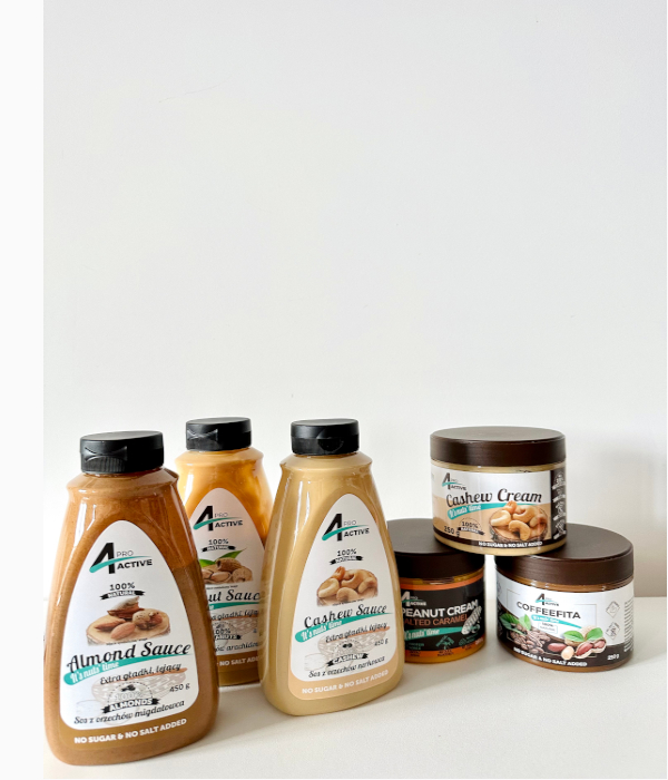 W naszym sklepie ze zdrową żywnością online znajdziesz kremy i masła orzechowe z serii 4proActive. To 100% naturalne, najwyższej jakości produkty. Pomagają zaspokoić zapotrzebowanie organizmu na białko oraz zdrowe tłuszcze. Nie tylko doskonale smakują, lecz także są paliwem dla ciała i umysłu. Nie zawierają dodatkowych konserwantów, oleju palmowego, soli czy cukrów. Produkowane są z wybranych gatunków orzechów.